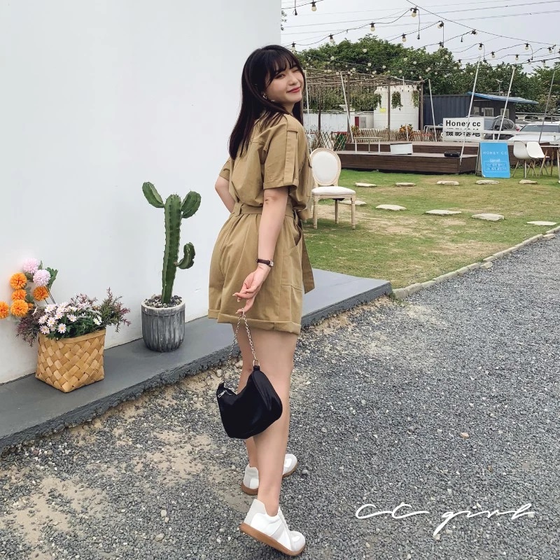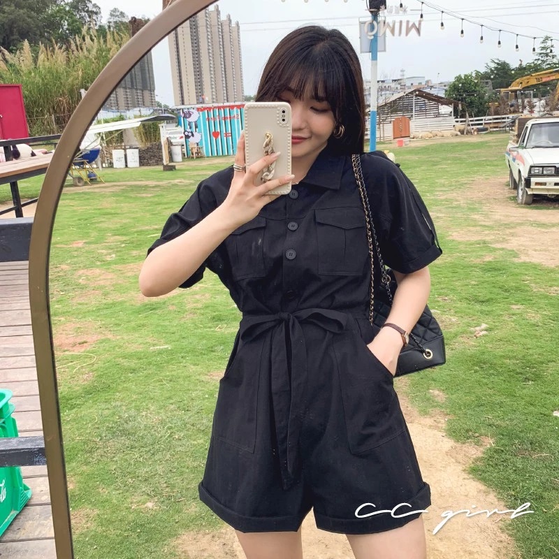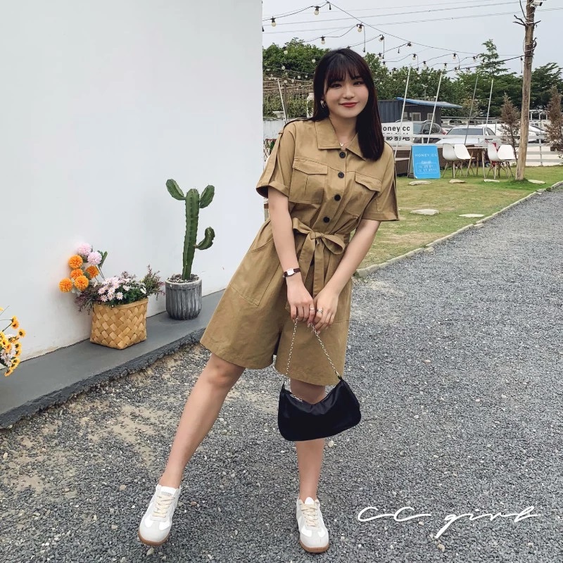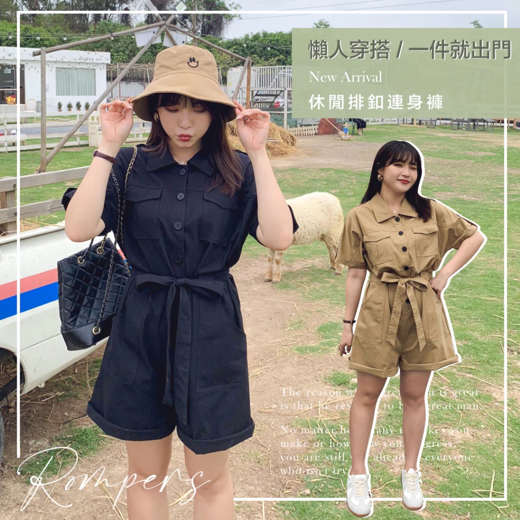 商品名稱:工裝排釦連身短褲/連身洋裝-共2款2色- 適M~5L 商品貨號:31059(有綁帶+真口袋) 材質:棉+聚酯纖維